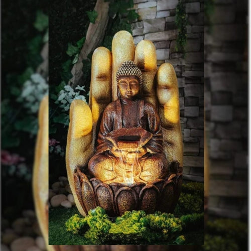 The "Buddha in Hand" fountain combines serene artistry with soothing water flow, creating a tranquil focal point for any space. Expertly crafted, it symbolizes peace and mindfulness, enhancing your environment with calming sounds and a meditative ambiance.